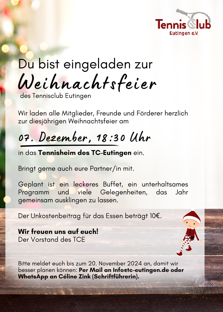 TC-Eutingen Sandgrube, Eutingen, DeutschlandEinladung zur Weihnachtsfeier des TC-Eutingen 🌟 Liebe Mitglieder, wir laden euch ganz herzlich zu unserer Weihnachtsfeier am 7. Dezember, um 18:30 Uhr in das Tennisheim des TC-Eutingens ein. Freut euch auf einen Abend mit leckerem Essen, lustigem Programm und nettem Beisammensein. Schaut euch gerne die weiteren Infos und die Einladung im Anhang an. Gebt […]