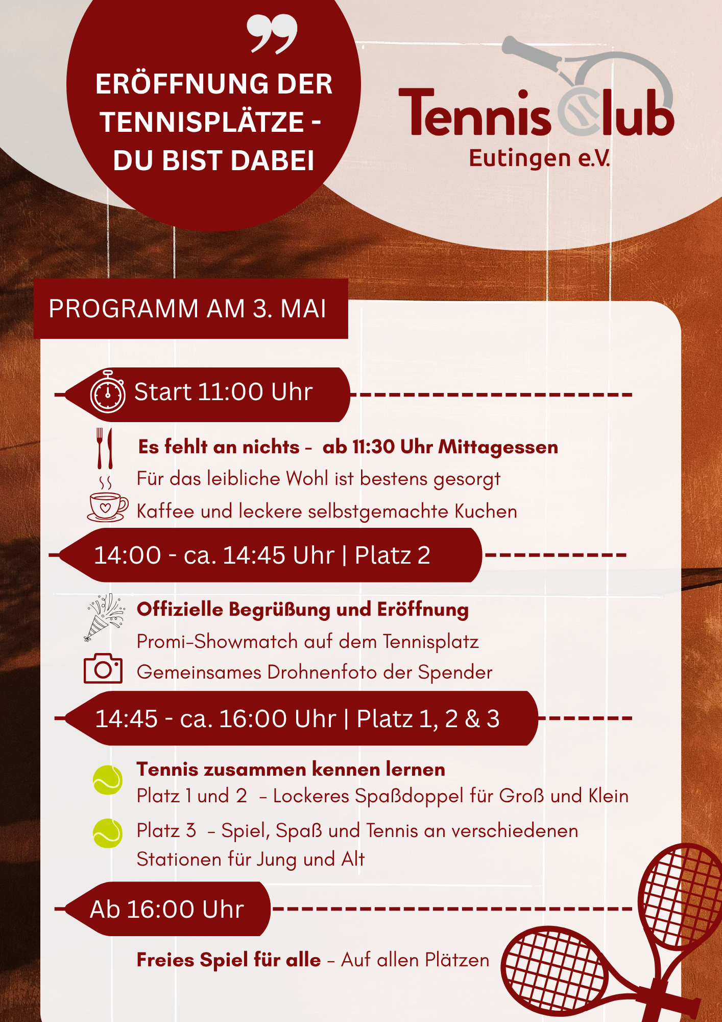 Liebe Mitglieder, am 21. März 2026 um 18:00 Uhr findet die jährliche Mitgliederversammlung des TC Eutingen e. V. statt. Merkt euch dieses Datum gerne schonmal vor. Eine offizielle Einladung mit Tagesordnung folgt zeitnah.